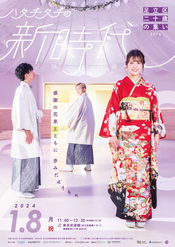 「二十歳の集い」の開催を広く周知し、対象者の参加を促進する目的で作成しました。二十歳の実行委員をモデルに、小さい頃遊んだ思い出の場所であるギャラクシティで撮影しました。モデルの3人は別々の方向を向いており、それぞれが自分の目指すものへと歩みだす様子を表現しています。