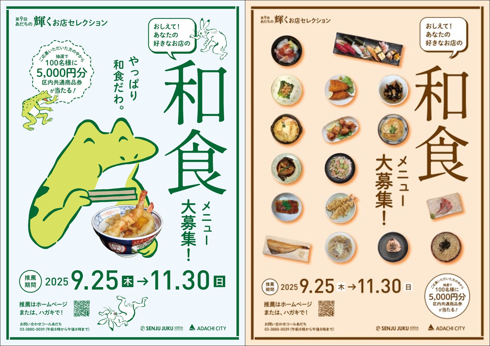 足立区内の輝くお店を、区内外に発信する事業「あだちの輝くお店セレクション」。第9回は「あなたの好きなお店の和食のメニュー」をテーマに皆様からお店を募集しました。日本古来の鳥獣戯画のようなカエルをメインにした、和の様子を表現したデザインと、数種類の和食を載せたデザインを作成。思わず推薦したくなるポスターを目指しました。