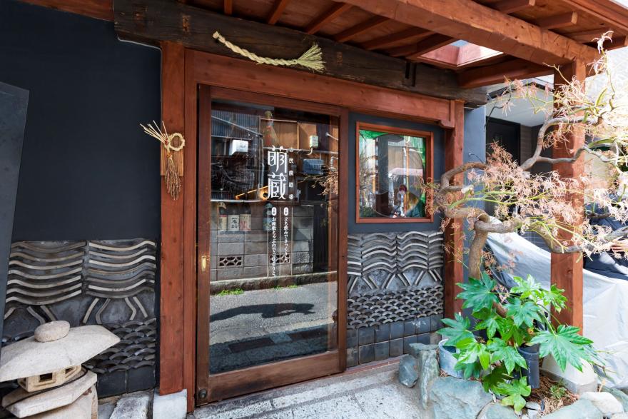 入口に蔵の扉の他、床屋や酒蔵などから集めた瓦、建具等をふんだんに使ってリノベーションされた「萌蔵」