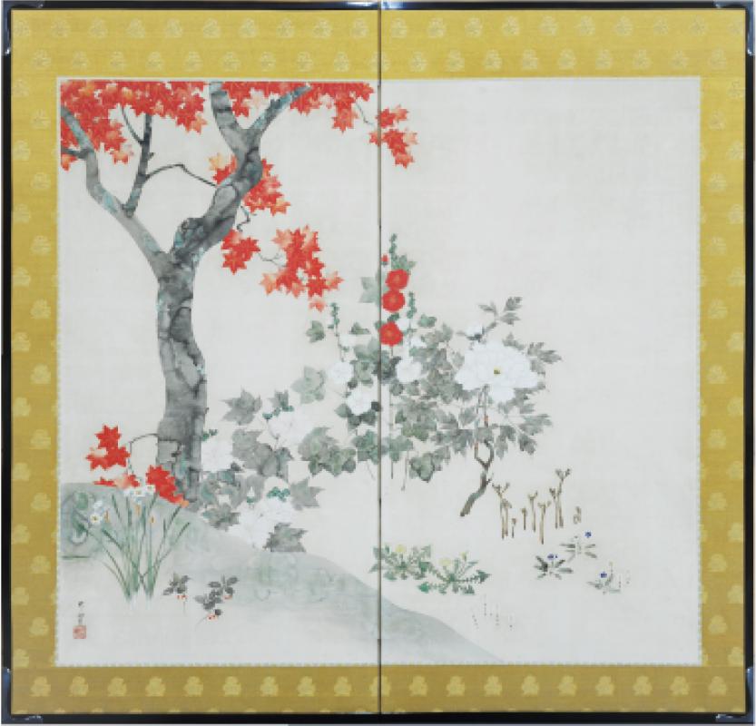 千住に居を構えた琳派絵師・村越向栄が描いた「四季草花図屏風(しきそうかずびょうぶ)」。千住仲町で米穀問屋「川善」を営んでいた渋谷家に伝来