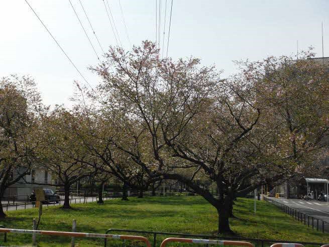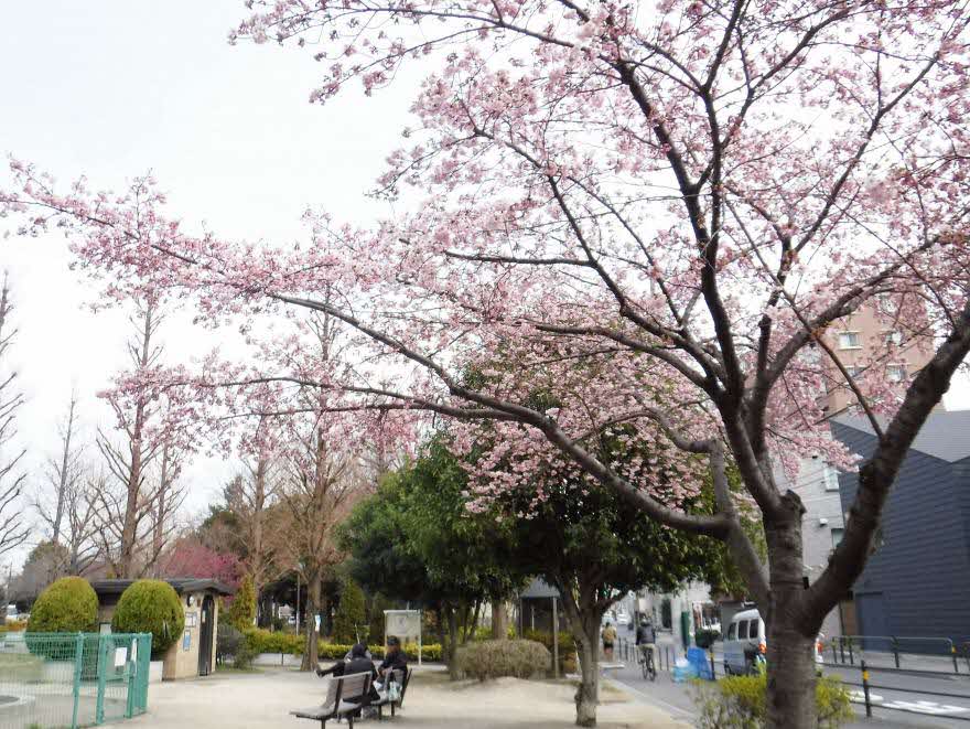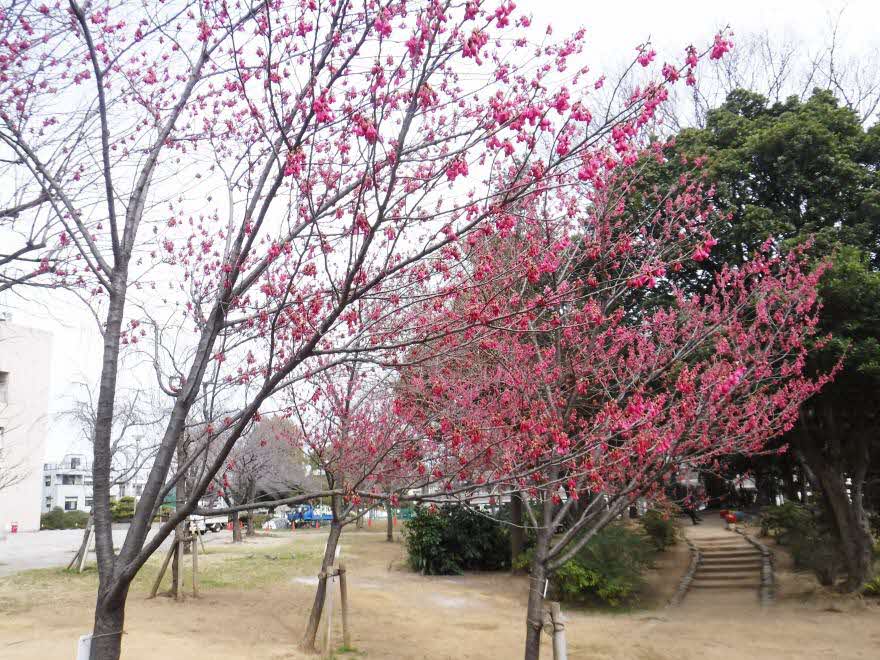 足立区役所裏の中央公園では、他の桜よりも早く春を運んでくる寒緋桜と大漁桜を楽しむことができる