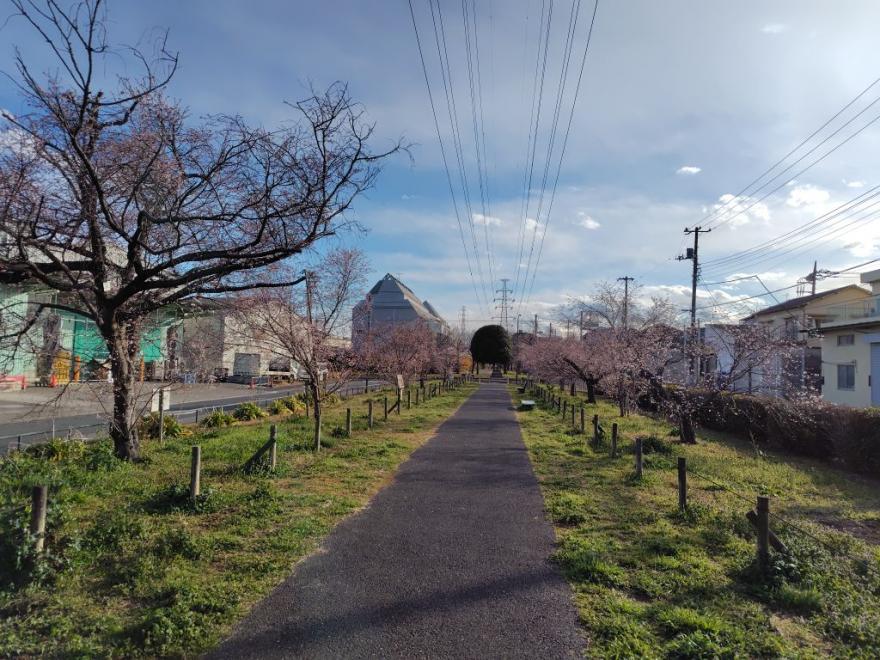 見沼代親水公園の西側に伸びる毛長川の土手沿い1.2kmの緑道には多くの桜並木が続く