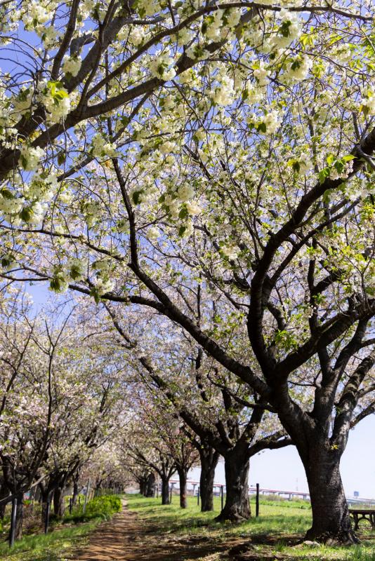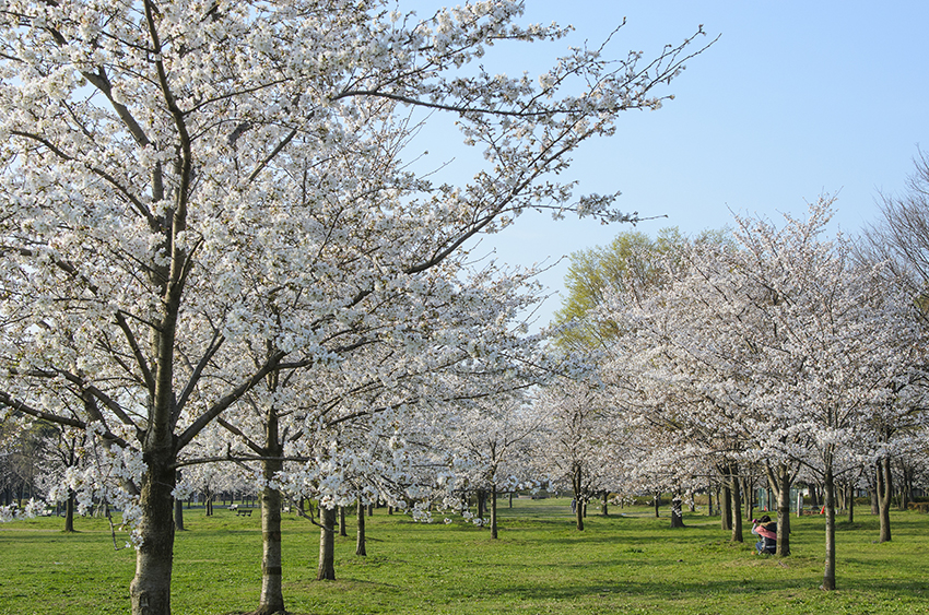 面積約15万9,000㎡の敷地内には約400本の桜が咲いている。U字型の園内の道一帯(約2km)が桜で彩られる