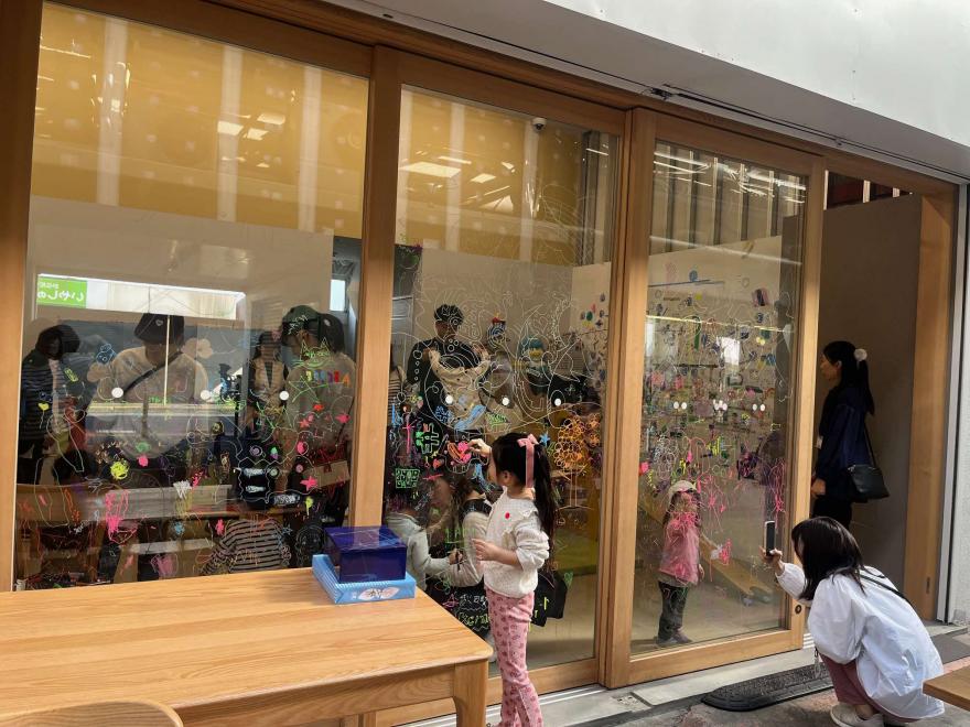 ワークショップ「僕たち私たちの夢の公園~海外の遊具を体験しながら英語を使ってワクワク想像力を広げてみよう!」の様子。あやセンターぐるぐるの窓に、子どもたちと一緒に夢の公園の絵を描いた