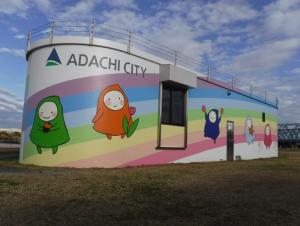 荒川河川敷の「虹の広場」にある公園トイレは、7色の虹をバックに6色のビュー坊のイラスト入り。竹の塚第一公園は通称名の昆虫公園にちなんで、太い幹の上をクワガタやカブトムシがはい回る様子のイラストなど、担当者の工夫の跡がしのばれます。佐野公園の利用者からは、「かわいい水玉模様で、臭いも気にならなくて、利用しても良いかなと思うようになった」とのお声を頂きました。