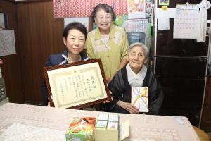 大谷さんの趣味は、女学生の頃から親しんでいた百人一首。いつもテーブルに置いてあるという百人一首の札を娘さんが手に取り、上の句を読み上げると、すらすらと下の句をそらんじ、99歳とは思えない記憶力を披露してくれた。また、大谷さんの長生きの秘訣も、食事の好き嫌いをしないこと。魚よりも肉が好きで、娘さんによれば、「テレビにお肉が出てくると、2人で「食べたいね」と話している」とのことであった。近藤区長の訪問に、はじめは緊張した面持ちであったが、次第に緊張もほぐれ、最後は笑顔で記念撮影に応じてくれた。