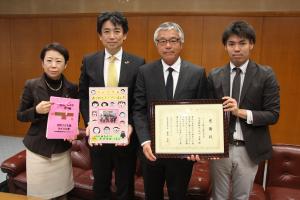 区内でランドセル、かばんの製造業を営み、「足立ブランド」にも認定されているナース鞄工株式会社(依田光展代表取締役)が、熊本地震で被災した子どもたちに役立ててもらおうと、今年4月から12月にかけて、熊本県御船町にランドセル173個を寄贈。この寄贈に対し、21日(水曜日)、藤木正幸御船町長から感謝の意をこめて、依田代表取締役に感謝状が贈呈され、同日、藤木町長と依田代表取締役はじめナース鞄工株式会社役員が近藤やよい足立区長を訪問し、寄贈ならびに感謝状贈呈の報告を行った。