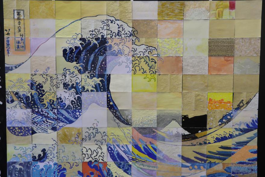 この巨大アートは、「すみだ北斎美術館」からいただいた冨嶽三十六景神奈川沖浪(ふがくさんじゅうろっけいかながわおきなみ)裏(うら)」原画データを100枚に分割して障がい者団体や障がいのある方々に配付。各々が色付けしたものをつなぎ合わせ、1つの大きな作品としている。