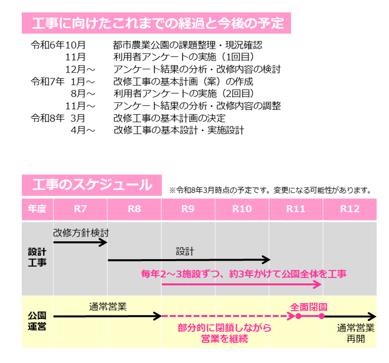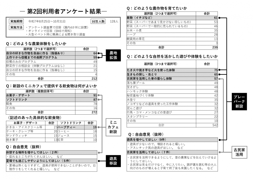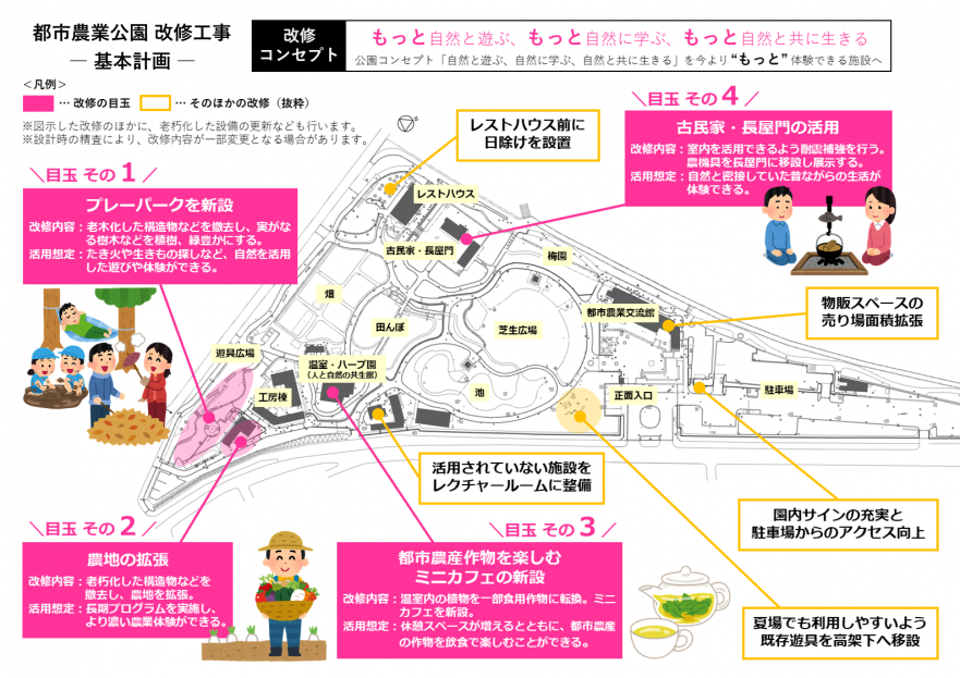 より魅力的な都市農業公園を目指し、第1回利用者アンケート(令和6年11月実施)、第2回利用者アンケート(令和7年8月から10月実施)を基に、改修工事の基本計画を作成しました。