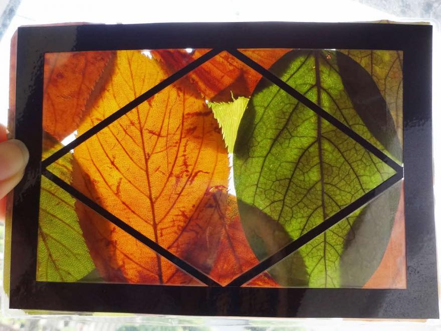 落ち葉を透明なシールに貼り、ステンドグラスを作ってみませんか。