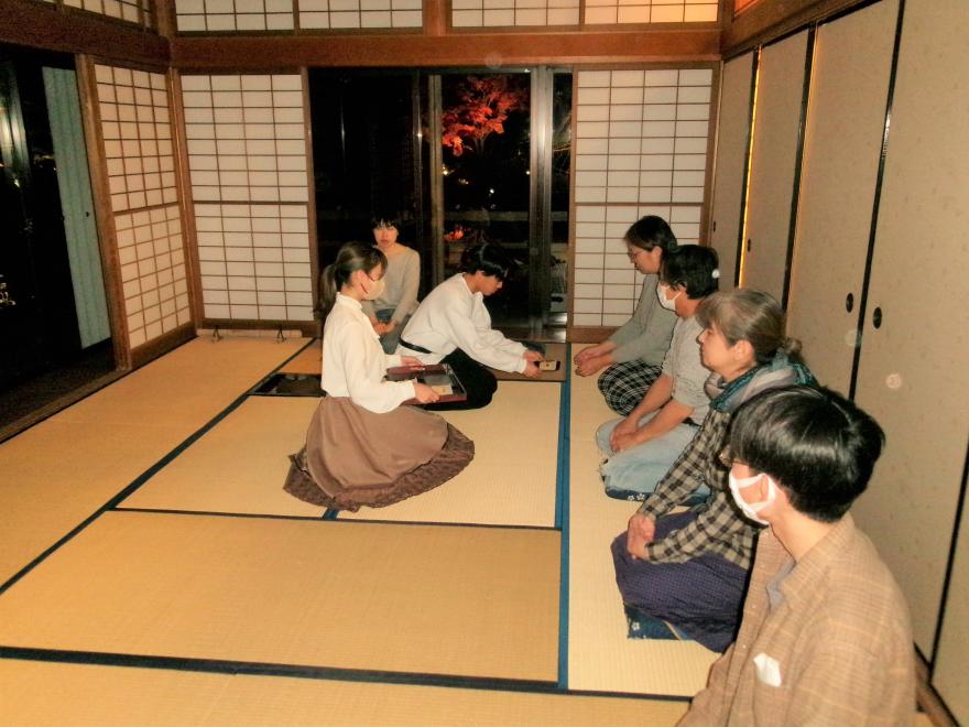 日本庭園のライトアップを眺められる桜花亭の和室で茶道のお点前を見学し、上生菓子と抹茶を楽しみませんか。
