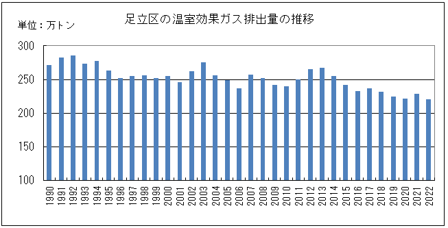 2022(令和4)年度の足立区の温室効果ガス排出量は220万7千トンで、前年度と比べて3.5%減少しました。