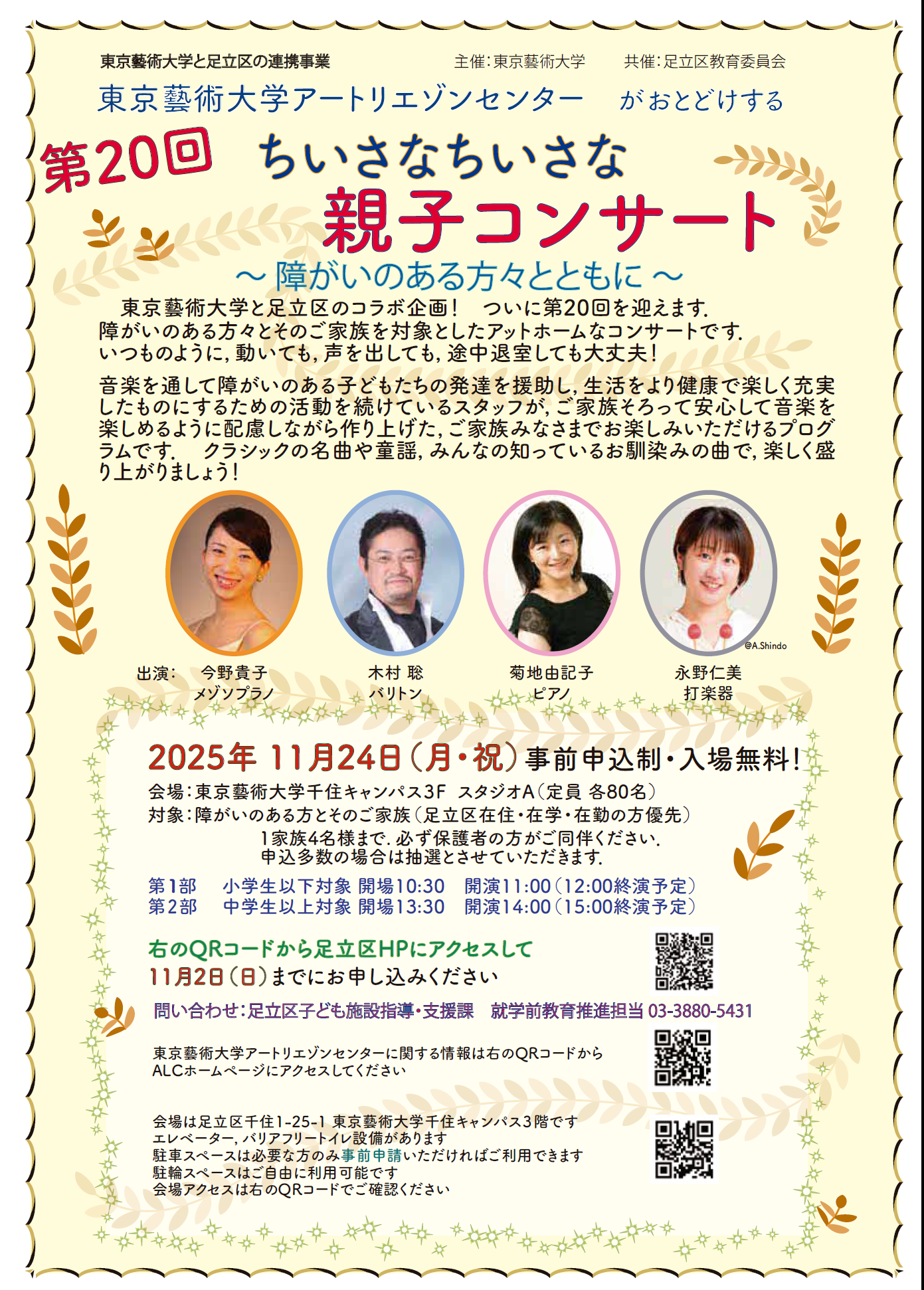 今年度は令和7年11月24日(月曜日・祝日)、東京藝術大学千住キャンパスにおいて第20回『ちいさなちいさな親子コンサート』を開催いたします。
