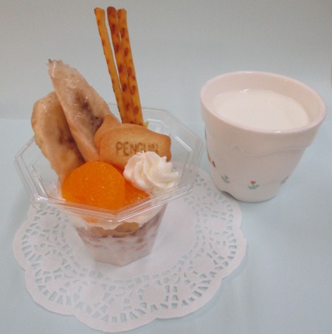 【間食】牛乳・フルーツケーキ ココアソース添え