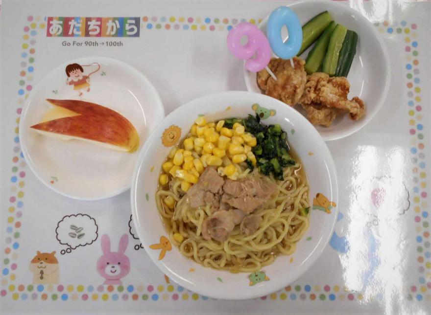 【昼食】しょうゆラーメン・鶏肉の唐揚げ・スティックきゅうり・りんご 作り方はこちら→(外部サイトへリンク)
