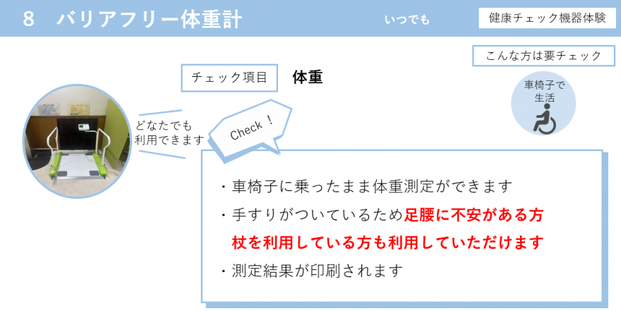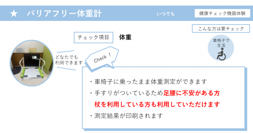 特定の機器については週1回(月曜日)、補助が必要な機器を追加設置して専門職が測定をお手伝いしています。