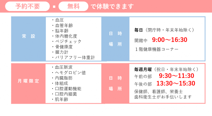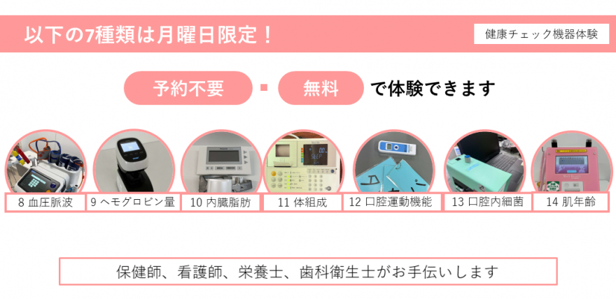 ただし、月曜日の機器拡大日は受付時間内であっても多数の参加があった場合は測定できない場合があります。
