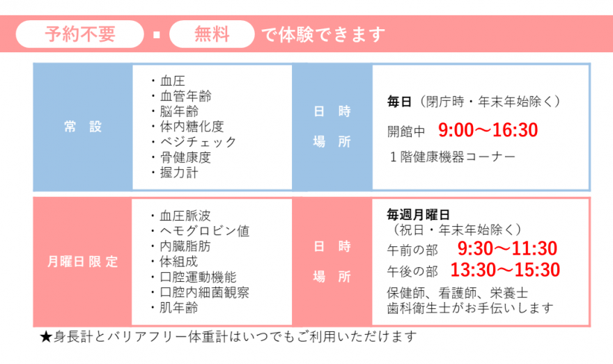 その際は、常設している健康機器をご利用ください。