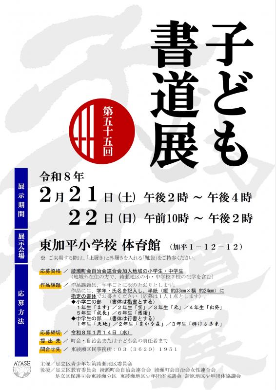 「子ども書道展」は綾瀬地区対の主要事業の1つであり、今年度で第55回目を迎えます。本事業は、綾瀬管内の青少年の健全育成及び社会を明るくする目的で、綾瀬町会自治会連合会の地域の子どもたちから書道作品を広く募集し、展覧会を開催するとともに、良い作品を書いた児童・生徒に対し表彰式を開催しています。