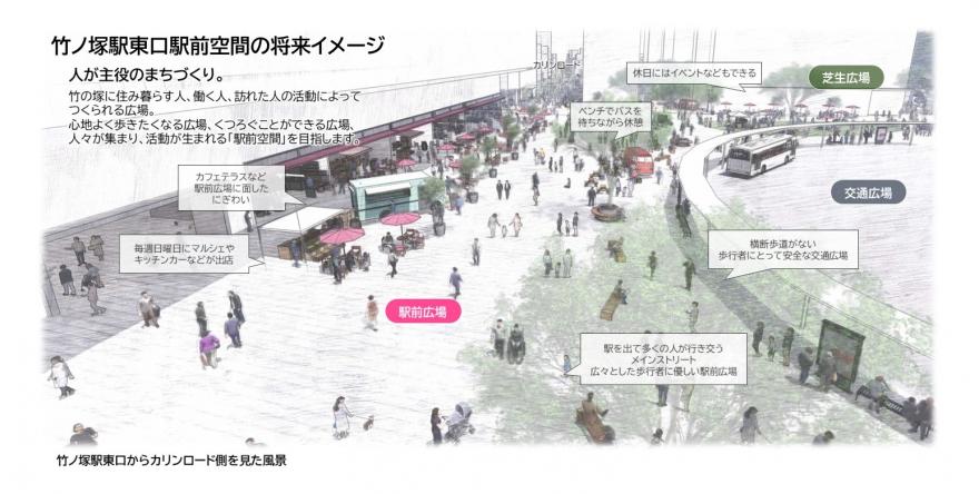 今後、イベントなどの機会に、このイメージを共有しながら皆様のご意見を伺い、駅前空間の検討を具体化していきます。