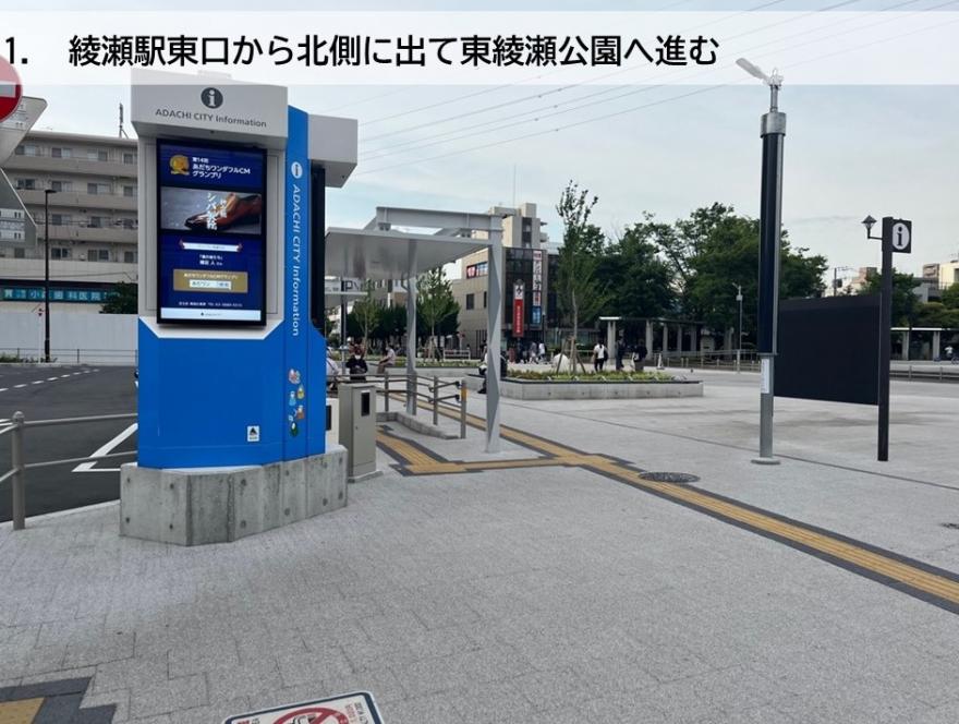 綾瀬駅の東口から北側に出て右に進みます。東綾瀬公園内の、足立区のお知らせが流れている電子掲示板の横を通り、北上しながら、東京武道館方面に向かいます。