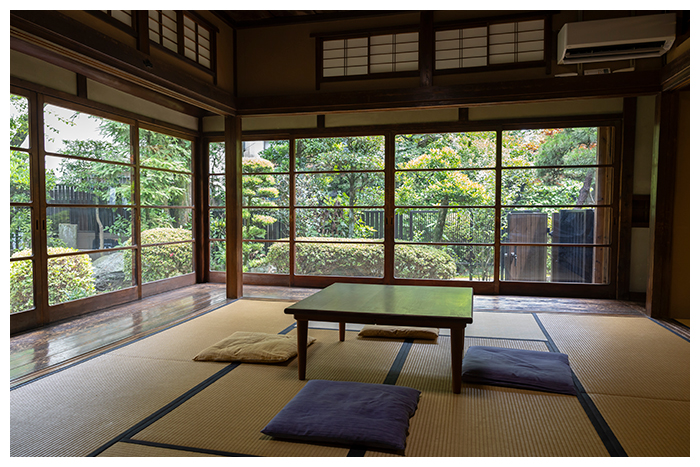 ここを拠点にするにあたって、畳を変えたり一部修繕はしましたが、ほとんど元のまま使っています。構造的にもなにもいじっていないので、そのままです。釘隠しといった当時の建築で用いられた装飾などが見られるポイントもそのまま残っています。縁側がみえるガラスも当時のままです。横からよく見ると外の景色が少し歪んで見えますよね。これは昔のガラスの特徴で現在ではほとんど作られておらず、最近の建築では見られない貴重なものだと聞いています。お庭もとてもきれいなのですが、これも当時の形をほぼそのまま残しています。ここに来た際は、ぜひ縁側に座ってお庭を眺めてほしいです。