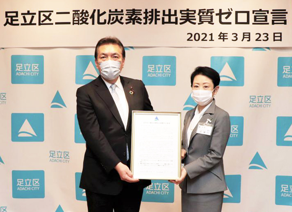 区と区議会は、足立区環境審議会のご意見を踏まえ、気候が地域を超えた非常事態であるとの認識をすべての区民・事業者・団体などと共有し、国や他自治体、企業とも連携を図りつつ、オール足立で2050年までにCO2排出実質ゼロ※をめざすことを2021年3月23日に宣言しました。