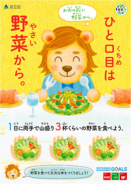 健康なカラダは、良い食習慣から。足立区では、保育園や幼稚園の就学前から小・中学生まで、健康になるための合言葉として「ひと口目は野菜から」を徹底しています。給食を通して、大人になっても健康を保てる生活習慣が、子どもたちに身についています。