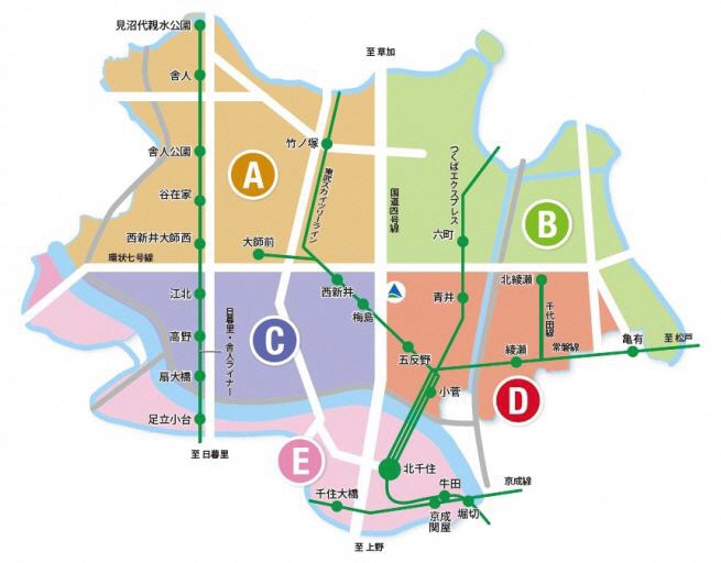 食料品、生鮮品、日用品 | パン、団子、飲料、お菓子、野菜、トイレットペーパー、洗剤等 | CDE |