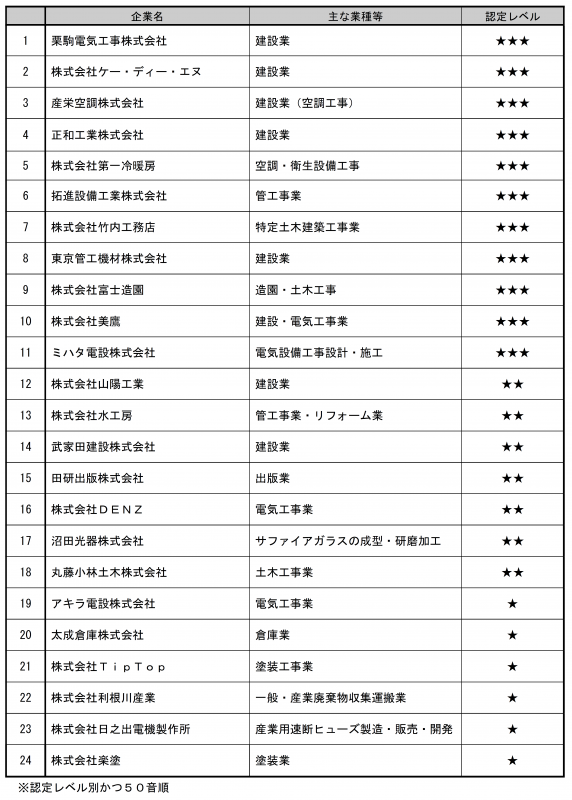 足立区では、中小企業が多い実情を踏まえ、企業それぞれが業態や社風に合わせて、段階的にワーク・ライフ・バランス(仕事と生活の調和)の取組みを行うことができるように令和元年度から「星(★)」認定による分野別認定制度に見直しました。令和4年度は、新規24社を『足立区ワーク・ライフ・バランス推進企業』と認定し、合計で134社となりました。