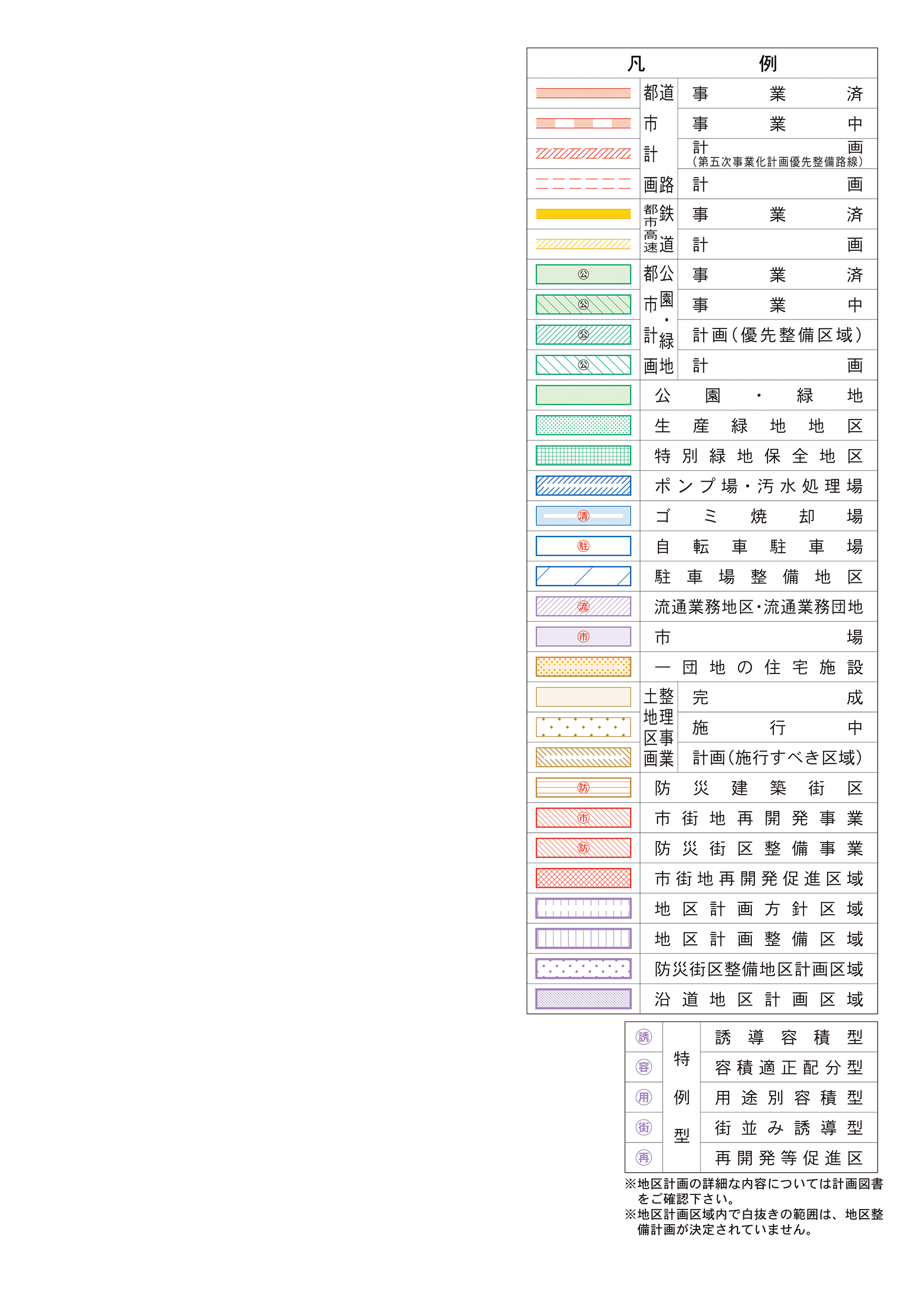 都市計画図2(都市計画施設等指定図)には以下の情報等が記載されています。
