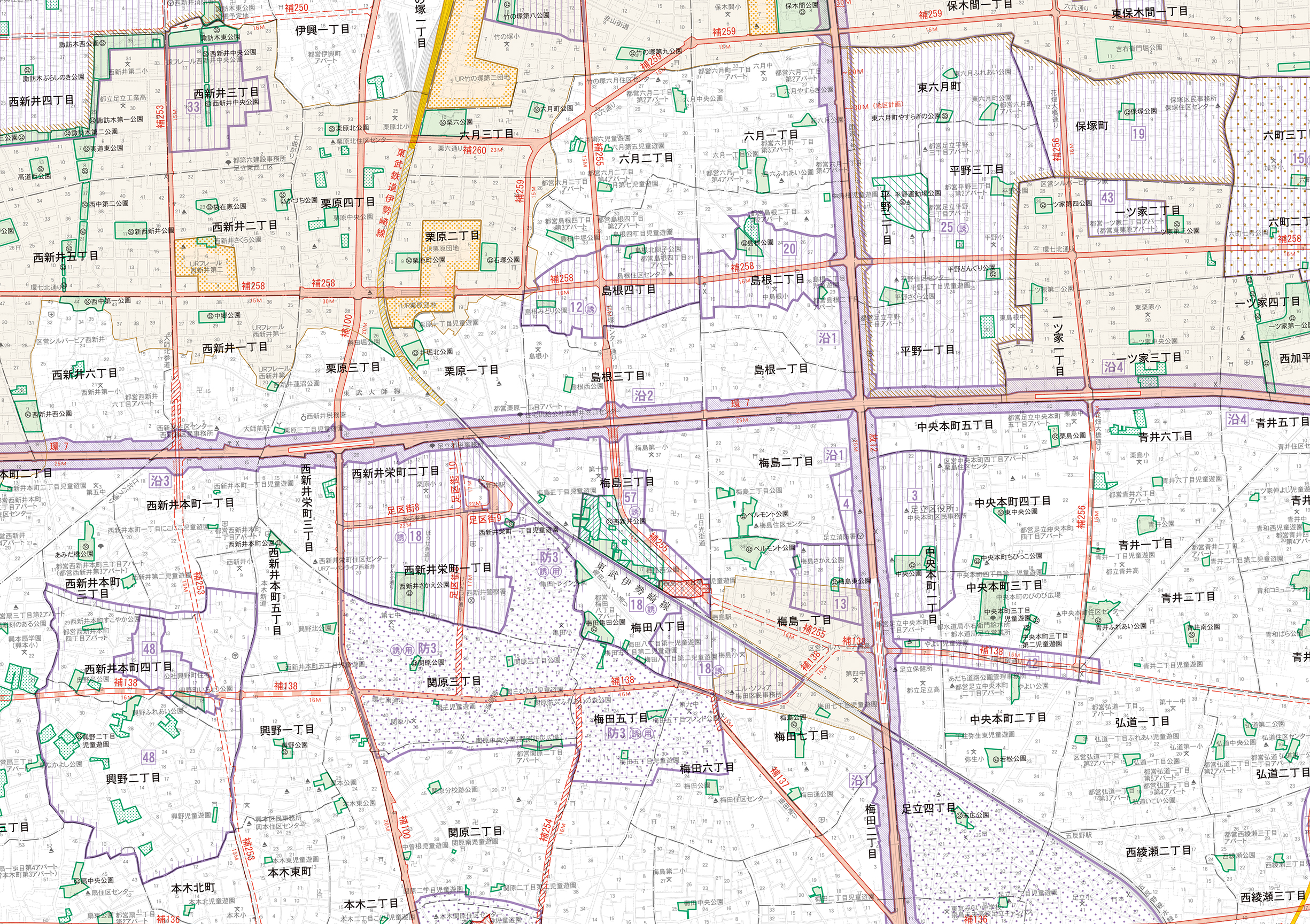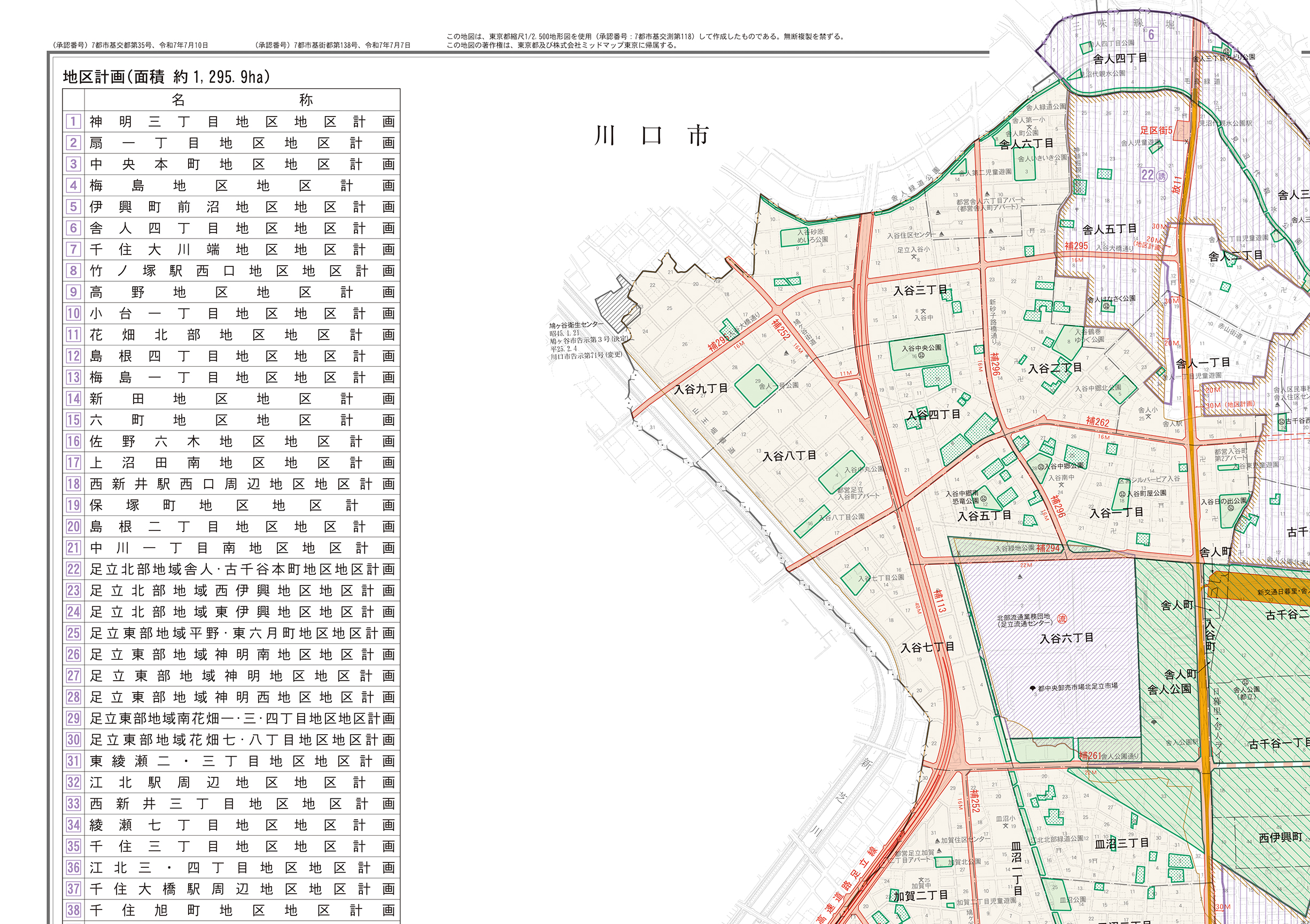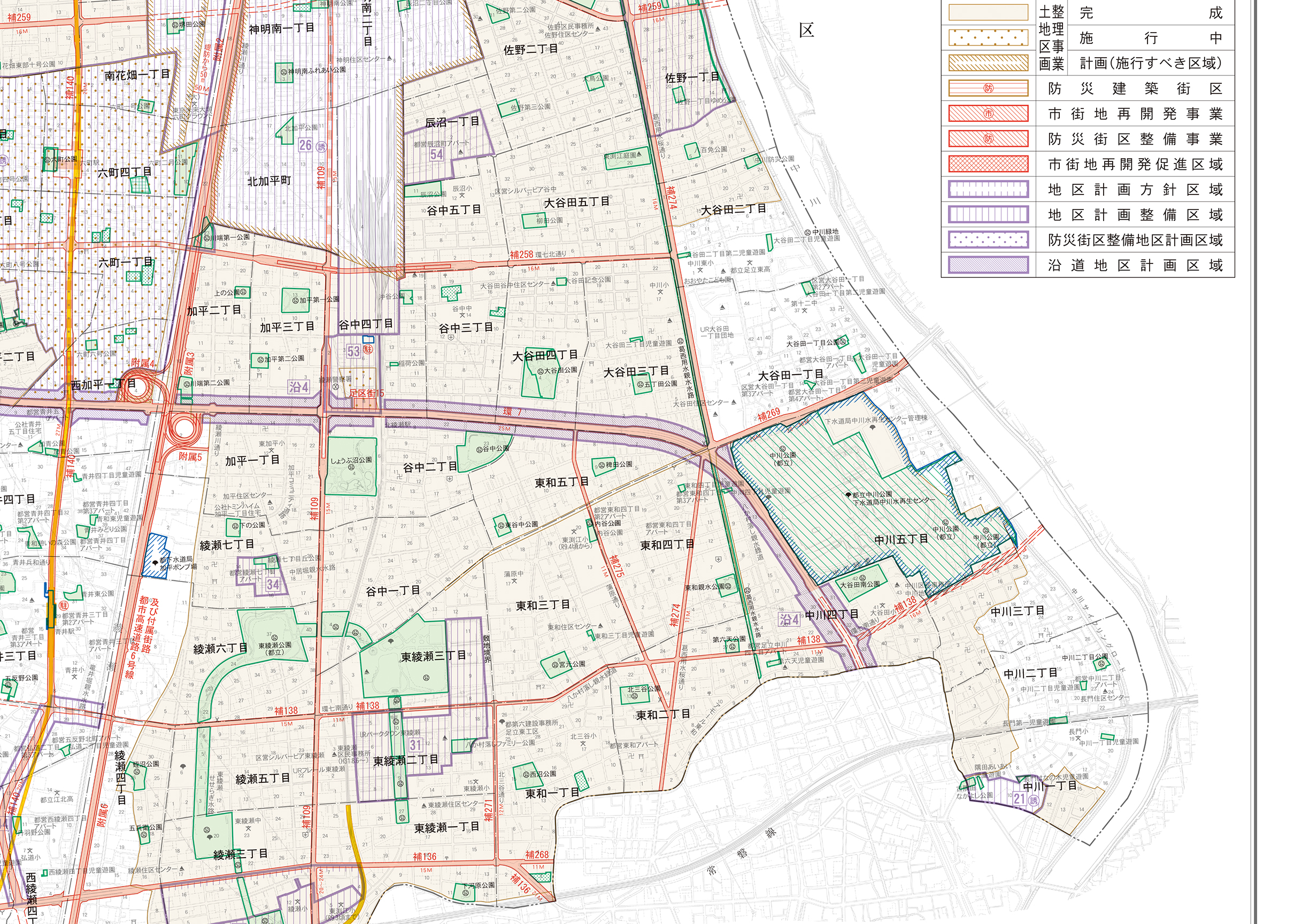 区では、都市計画情報(用途地域、高度地区、防火指定、都市計画施設、地区計画など)を「1 あだち地図情報提供サービス」及び「2 足立区都市計画図」にて提供しています。